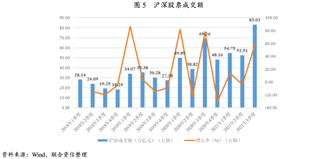 自2020年三季度股市交易活躍程度達(dá)到階段性峰值以來,股市交易的活躍程度有所下降,但一直維持在歷史的相對(duì)高位,滬深兩市成交額基本穩(wěn)定在50萬億元規(guī)模上下。2021年三季度,滬深兩市成交量83.03萬億元,環(huán)比增長58.12%,同比增長19.88%;市場交投活躍程度大幅攀升,滬深兩市成交額創(chuàng)歷史新高,整體看,經(jīng)紀(jì)業(yè)務(wù)具備較強(qiáng)增長動(dòng)力,有力支撐證券公司收入增長。
