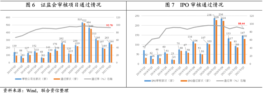 2021年三季度,發(fā)審委/上市委/并購重組委員會(huì)審核項(xiàng)目總家次及通過家次分別為263家和244家,分別為二季度的1.34倍和1.32倍;其中IPO審核家次及過會(huì)家次分別為147家和130家,通過率為88.44%,環(huán)比下降4.03個(gè)百分點(diǎn)。隨著注冊(cè)制的落地,發(fā)審委/上市委/并購重組委員會(huì)審核項(xiàng)目數(shù)量在2020年下半年達(dá)到峰值,雖然2021年三季度的審核及通過項(xiàng)目數(shù)量較二季度大幅增加,但較上年同期仍有所減少。