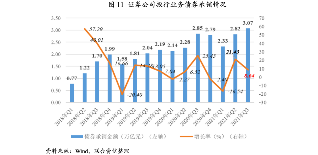 證券公司債券承銷規(guī)模同比、環(huán)比均有一定幅度增長。2021年三季度,證券公司各類債券承銷金額3.07萬億元,同比增長7.45%,環(huán)比增長8.64%。