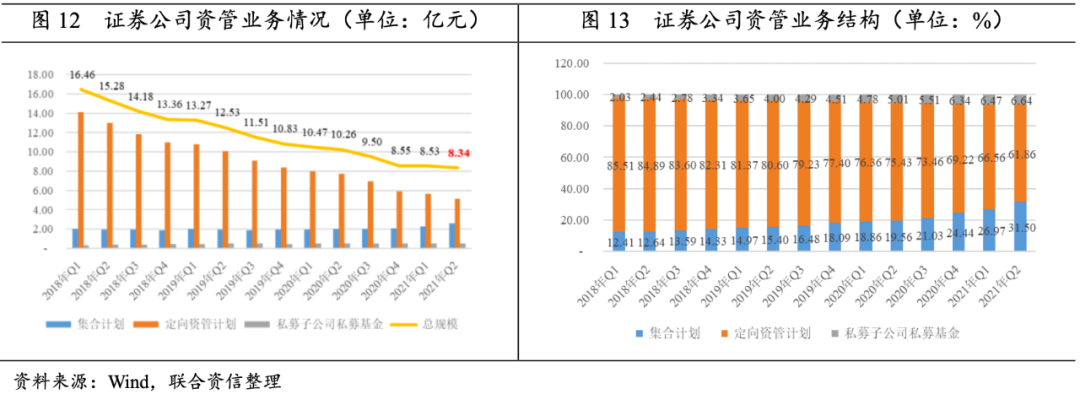 資產(chǎn)管理業(yè)務(wù)規(guī)模保持下降趨勢,集合計(jì)劃占比有所增加。“資管新規(guī)”過渡期進(jìn)入“倒計(jì)時(shí)”,截至2021年6月末,證券公司資管業(yè)務(wù)總規(guī)模延續(xù)下降態(tài)勢,主要系定向資管計(jì)劃的壓降;集合計(jì)劃和私募基金管理規(guī)模穩(wěn)步增長;證券公司資管業(yè)務(wù)仍以定向資管業(yè)務(wù)為主,但占比持續(xù)下降,集合計(jì)劃占比繼續(xù)提升,私募基金占比雖有所增長但占比仍較小,資產(chǎn)管理業(yè)務(wù)整體結(jié)構(gòu)有所優(yōu)化。