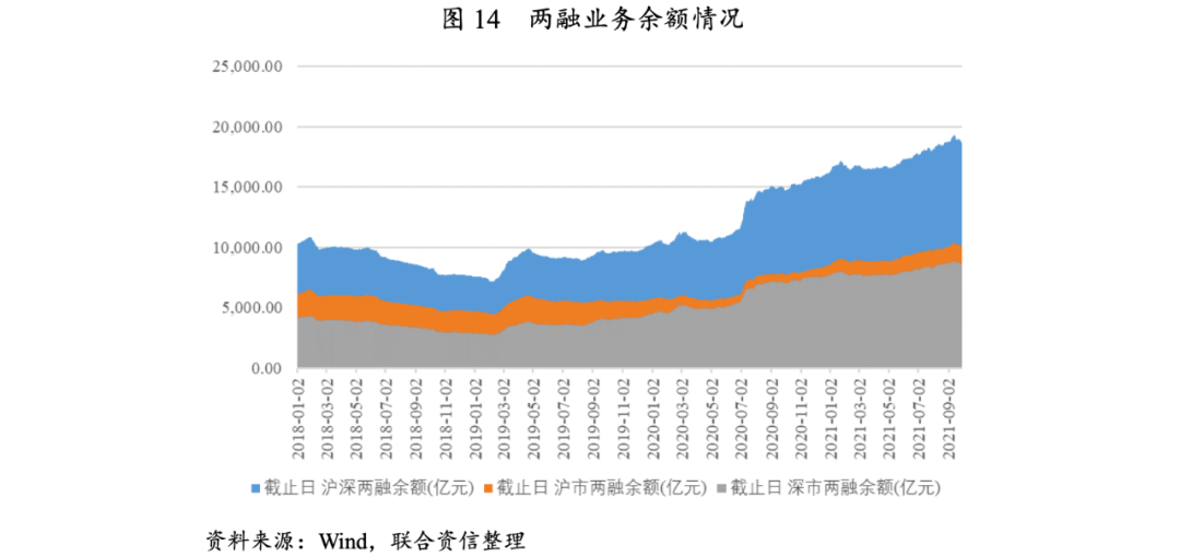 2021年三季度,滬深兩融余額隨市場活躍度攀升不斷創(chuàng)出新高。2020年至今,證券市場持續(xù)回暖,滬深兩市兩融余額呈增長態(tài)勢。2021年一季度,滬深指數(shù)有所調(diào)整,兩融余額在1月達(dá)到階段性高點(diǎn)17156.53億元后有所回落;2021年二、三季度,隨著市場活躍度的攀升,兩融余額不斷創(chuàng)出新高。截至2021年9月末,滬深兩市兩融余額18415.25億元,較上季度末增長3.21%。
