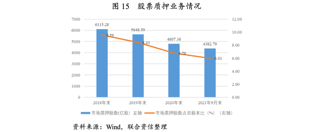 質(zhì)押股份市值以及質(zhì)押股數(shù)占總股本比重持續(xù)下降,同時(shí)證券公司大規(guī)模計(jì)提減值準(zhǔn)備,股票質(zhì)押高比例質(zhì)押風(fēng)險(xiǎn)進(jìn)一步緩解。截至2021年9月末,股票質(zhì)押市場質(zhì)押股數(shù)占總股本比6.01%,較二季度末下降0.36個(gè)百分點(diǎn);市場質(zhì)押股份市值合計(jì)41846.22億元,較二季度末下降2.48%。控股股東(按第一大股東口徑統(tǒng)計(jì),下同)持股質(zhì)押比例超過80%的上市公司家數(shù)293家,較二季度末減少15家,高比例質(zhì)押風(fēng)險(xiǎn)進(jìn)一步緩解。