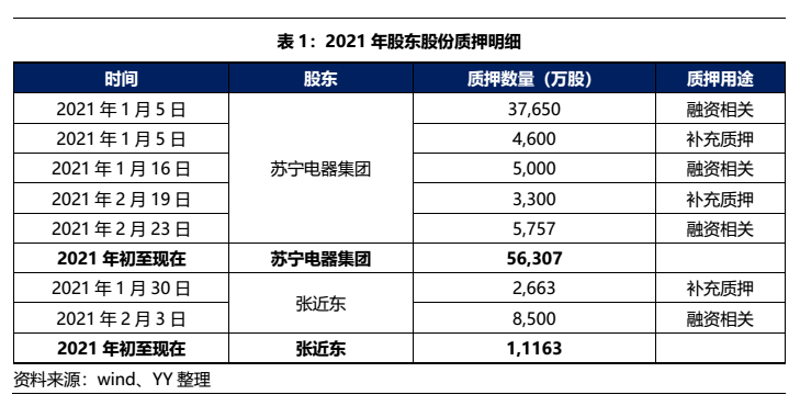 從時間線及主體來看,2021年以來電器集團共質押了近5.63億股,張近東共質押了1.12億股,主要用于補充質押和融資相關。截至2021年2月23日,蘇寧電器集團持有公司19.88%的股份,共計質押8.97億股,占所持股份的48.47%;截至2021年2月3日,張近東及一致行動人蘇寧控股集團有限公司合計持有公司24.94%股份,共計質押4.11億股,占所持股份的17.72%。