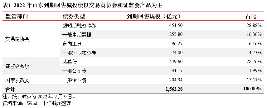 2022年交易商協會、證監會系統和國家發改委三大監管部門山東城投債到期回售規模分別為877.57億元、480.77億元和204.94億元,占總規模的比重分別為56.14%、30.75%和13.11%。分品種看,山東2022年到期回售城投債中超短融和私募債占比較高,二者占總額比重分別為28.88%和28.76%,企業債占比13.11%。