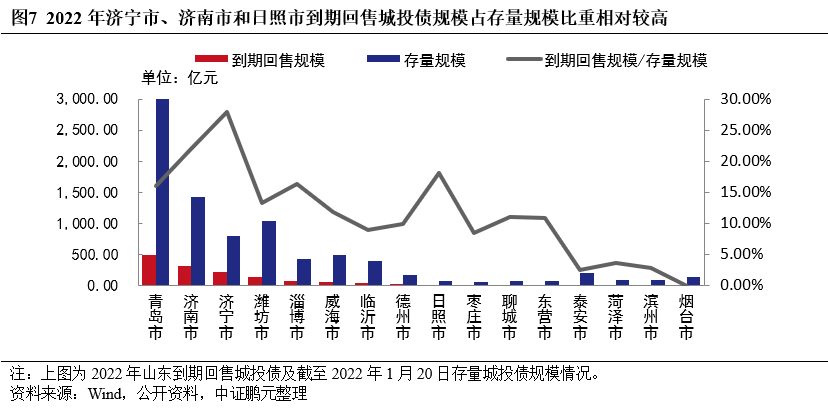 從各區域到期回售規模相對占比(到期回售規模/存量債券規模)看,濟寧市、濟南市和日照市到期回售規模占當期存量城投債規模的比重分別為27.86%、21.98%和18.14%;到期回售規模排名靠前的青島市和濰坊市該比例分別為16.03%和13.30%,2022年償還集中度不高。