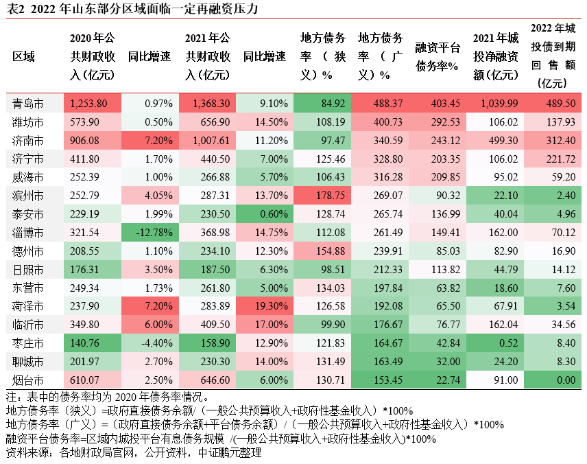 債務率方面,除煙臺市外,省內其他公共財政收入排名前列的區域債務率水平均排名靠前。其中,青島市財政實力極強,狹義地方債務率水平不高,依托強大的經濟財政實力,2021年青島城投凈融資額1,039.99億元,位列全省首位,區域平臺融資活躍,青島市2022年城投到期回售規模達489.50億元,但基于較強的經濟財政基礎和良好的再融資環境,到期回售及債務續接壓力整體可控。