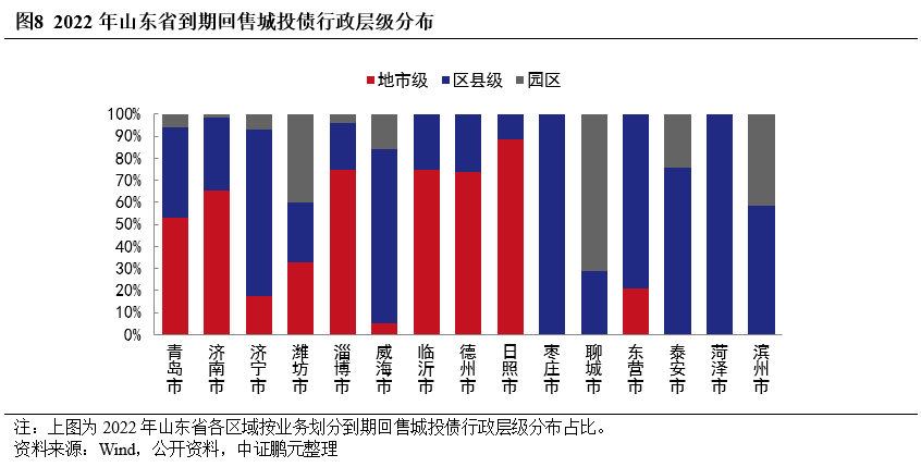 地市級平臺到期回售以青島和濟南為主,濟寧和青島的區縣級平臺到期回售規模較為突出,園區級平臺到期回售集中在濟南、濰坊和青島