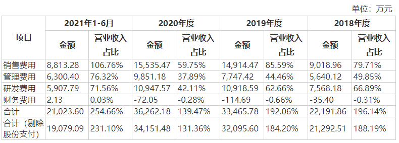 根據招股書,報告期星環科技的期間費用率(剔除股份支付)分別為188.19%、184.2%、131.36%及231.1%,即期間費用均超過了營業收入,導致虧損。由于營業收入具有季節性,集中在下半年,從而2021年上半年的期間費用率畸高,這里不做討論。