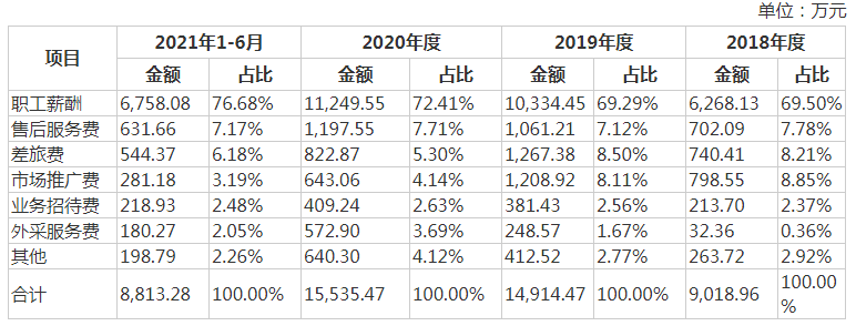 從銷售費用構成來看,市場推廣費用占比逐期下降,至2021年上半年僅為3.19%,而銷售人員薪酬和售后服務費成為占比最高的兩項,兩者在2020年及2021年上半年合計占比8成以上。