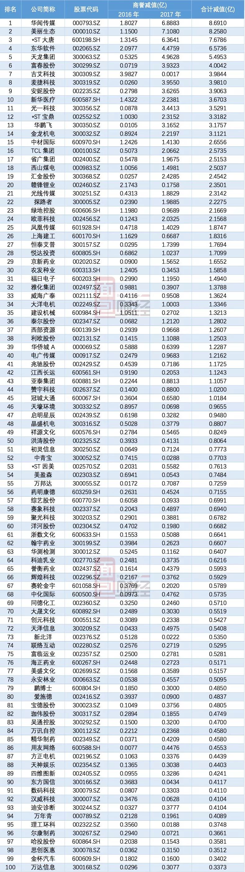 以下是2017年商譽(yù)減值金額排名前100的公司名單: