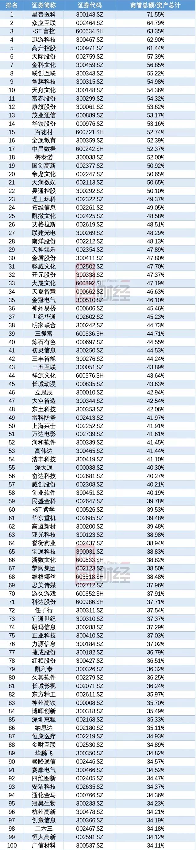 按照商譽(yù)占?xì)w屬于母公司股東權(quán)益和資產(chǎn)總額占比,排名前100名如下: