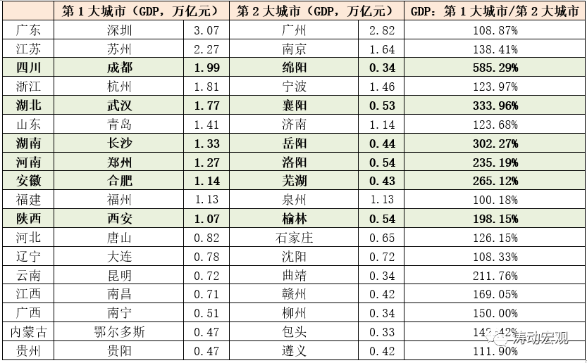 具體看,成都的經(jīng)濟(jì)總量達(dá)到1.99萬億,是四川第2大城市綿陽的5.85倍;武漢的經(jīng)濟(jì)總量達(dá)到1.77萬億,是湖北第2大城市襄陽的3.34倍;長沙的經(jīng)濟(jì)總量達(dá)到1.33萬億,是湖南第2大城市岳陽的3.02倍;合肥的經(jīng)濟(jì)總量達(dá)到1.14萬億,是安徽第2大城市蕪湖的2.65倍;鄭州的經(jīng)濟(jì)總量達(dá)到1.27萬億,是河南第2大城市洛陽的2.35倍;西安的經(jīng)濟(jì)總量達(dá)到1.07萬億,是陜西第2大城市榆林的1.98倍等等。