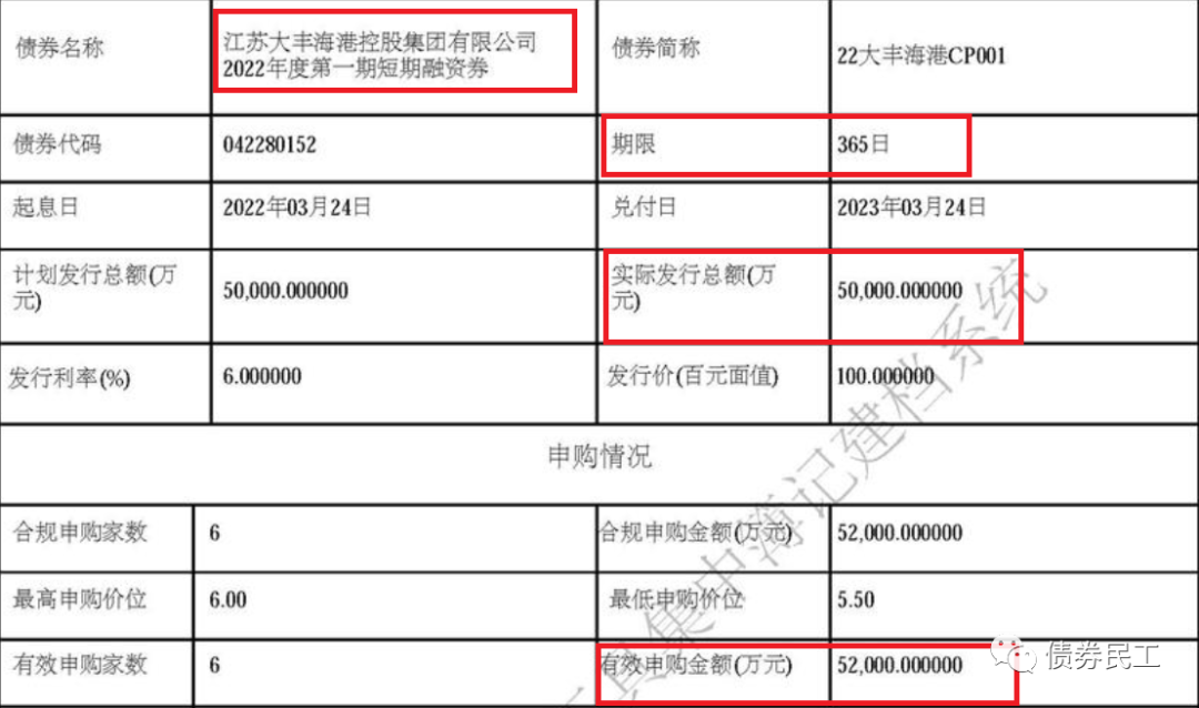 2022年5月25日,江蘇大豐海港控股集團有限公司(以下簡稱“大豐控股”)發行2022年度第二期短期融資券,發行金額為5億元,有效申購金額為298.50億元,申購倍數高達59.7倍!!!這個申購倍數,是債券民工見過的最高的,之前只見過10倍的。“22大豐海港CP002”的債券期限為1年,最終發行利率為5.0%。