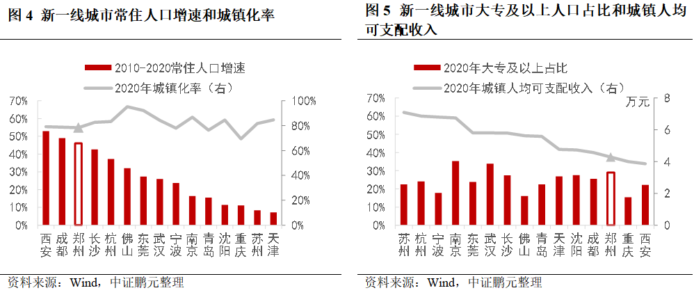 與14個其他新一線城市相比,近十年來鄭州的人口增速位于第三位,大專及以上人口占比位于第三,城鎮化率位于第十二位,人均可支配收入位于第十三位。鄭州快速擴張的城市規模,吸引了更多的年輕人到鄭州,但工資水平和就業環境長期相對一般。雖然,較低城鎮化率給予了再發展空間,“如何留住人”是關鍵,包括農民轉移就業人口和大學畢業生等高等人才。