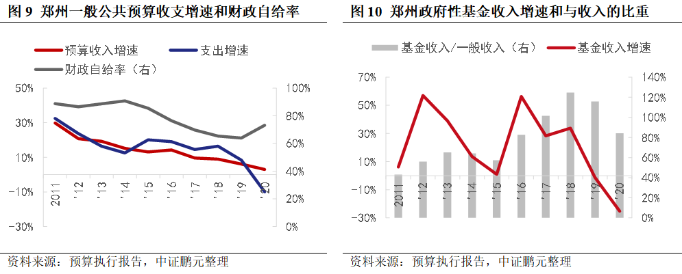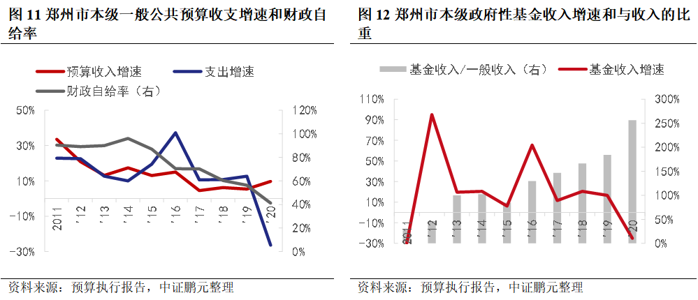 2011年鄭州市財政預算收入增速下滑明顯,2017年以來隨著減稅降費的推進,收入增速持續下降。而財政支出增速多年高于收入增速,財政自給率下降。政府性基金收入增速波動較大,基金收入與一般公共預算收入的比重持續上升,政府對土地出讓收入依賴度較高。2020年受新冠疫情影響,土地出讓收入大幅下降,財政支出也出現大幅下降。從市本級口徑看,政府性基金收入與財政支出增速的走勢吻合度更高。政府債務方面,鄭州市以一般地方政府債券為主,截至2020年末,政府債務余額2,173.80億元,其中,專項債余額907.50億元,狹義債務率為94%。截至2022年3月5日,鄭州存量城投債210只,規模1,949.16億元。整體看,鄭州政府對土地出讓收入依賴度較高。