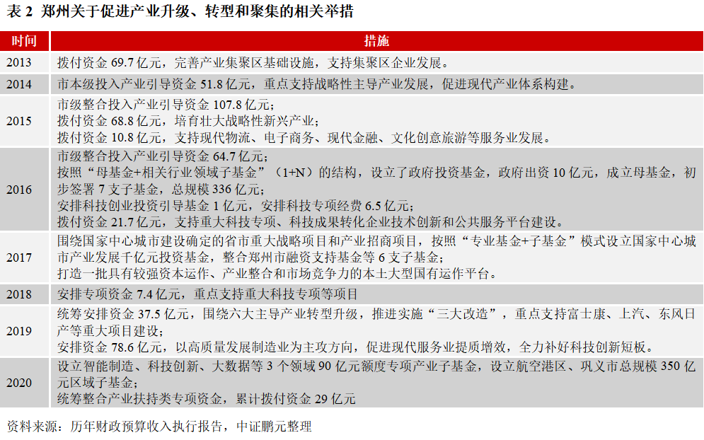 從2017年規劃版圖看,鄭州近年致力于構建“一主一城三區四組團”的城鎮布局結構,2019年12月發布《鄭州市“十四五”規劃編制工作方案》(簡稱《規劃》),“東強、南動、西美、北靜、中優、外聯”將成為下一個五年的發展方向,其中東部要努力打造全省對外開放窗口、產城融合發展示范區和全國重要的先進制造業、現代服務業基地。具體看:(1)2016年在主城區西北部成立鄭州高新區(雙湖科技城),聚焦智慧產業,堅持智能傳感、網絡空間安全、大數據、北斗導航等主導產業定位。根據《規劃》,未來將致力于國內智能傳感產業。(2)2012年開始規劃并于2016年加速建設常西湖新區,位于主城區西部,定位鄭州生態、智能的中央文化區,已建成博物館、音樂廳等多個文化基礎設施。2020年7月,該片區北部重新定位,重點發展科技服務與智慧應用產業,彌補區域產業空缺;(3)2013年鄭州航空港經濟綜合實驗區成立,位于主城區南部,定位與鄭州主城區形成“雙城”格局,重點發展具有臨空指向性和關聯性的高端產業,包括航空物流業、高端制造業和現代服務業。《規劃》明確北部空港新城、中部空鐵新城與南部雙鶴湖科技城三大產城融合功能分區。(4)2003年位于市區東部的鄭東新區開始建設,定位金融集聚核心功能區,全省推進城鎮化建設的先行區。2020年在鄭東新區北部重拳打造中原科技園,重新規劃鄭東新區優質地塊,聚合龍湖北部、智慧島、科學谷三大片區,組成包括“中原科技城、龍子湖人才中心、白沙科學谷”的中原科技帶。中原科技城產業布局圍繞五大核心產業——數字文創、信息技術、前沿科技、生命科學、人才教育。根據《規劃》,將高質量發展中原科技城、高水準推進五大核心板塊建設。(5)鄭州經濟技術開發區于1993年成立,2000年2月獲批為河南省首個國家級經濟技術開發區。2022年2月,商務部公布“2021年國家級經濟技術開發區綜合發展水平考核評價”結果,鄭州經開區排名第22位。《規劃》明確經開區圍繞先進制造、現代物流、生物醫藥及健康等方向推進園區建設,推動主導產業發展集聚。