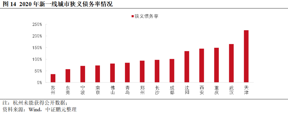 與其他14個新一線城市相比,鄭州的狹義債務率位于第八位,從債務結構看,鄭州專項債余額占比較低,2020年為42%,武漢、成都和西安均在65%以上。