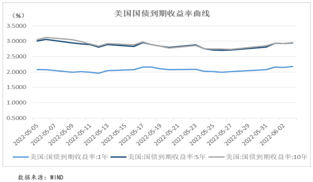 本周,美聯(lián)儲(chǔ)理事沃勒“支持加息至中性水平以遏制通脹”的“鷹派”言論以及美聯(lián)儲(chǔ)主席鮑威爾在與美國總統(tǒng)拜登會(huì)面中再度強(qiáng)調(diào)了遏制通脹的緊迫性的論調(diào)都為美債收益率上行提供支撐。此外,本周美聯(lián)儲(chǔ)正式開啟“縮表”也推動(dòng)長端收益率上行。具體來看,本周1年期、5年期和10年期美國國債平均收益率較上周全線上漲11.85個(gè)BP、15.30個(gè)BP和14.55個(gè)BP至2.14%、2.91%和2.92%。