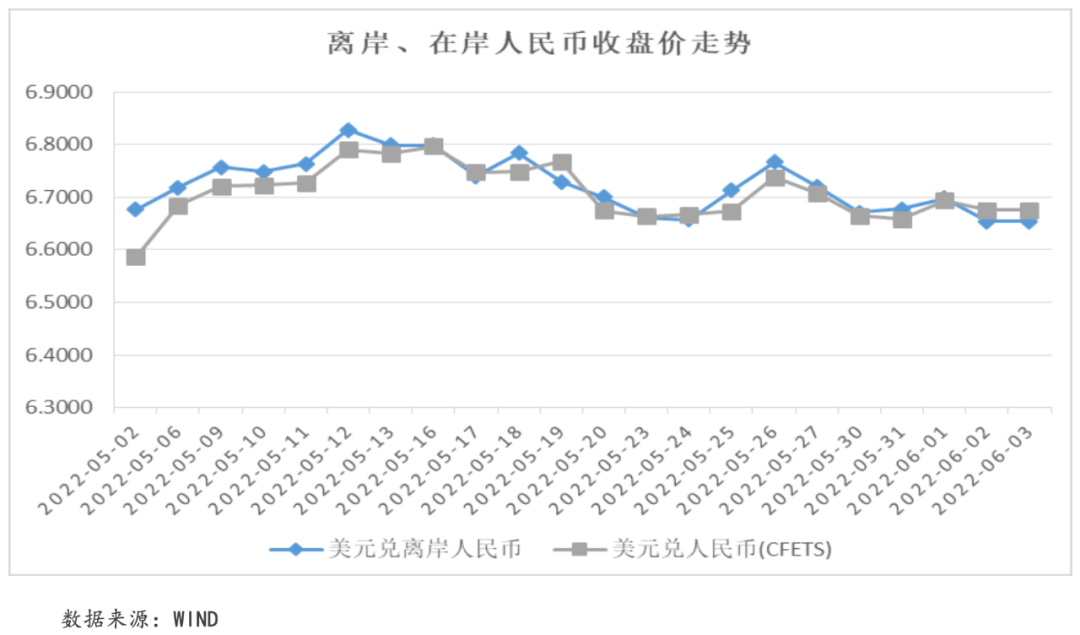 本周,中國疫情好轉(zhuǎn),上海宣布全面復(fù)工復(fù)產(chǎn),疊加一系列穩(wěn)經(jīng)濟(jì)的宏觀政策的出臺(tái),中國經(jīng)濟(jì)回暖的預(yù)期增強(qiáng)支撐人民幣匯率有所走高。截至周五,美元兌離岸人民幣匯率收于6.6537,周內(nèi)收跌1.05%;美元兌在岸人民幣匯率收于6.6750,周內(nèi)收跌0.45%。