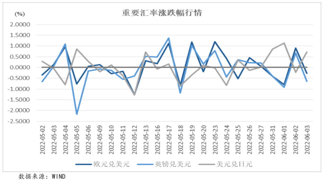 本周,歐元區(qū)5月通脹率創(chuàng)下歷史新高,引發(fā)市場(chǎng)對(duì)于歐洲央行7月加息的預(yù)期進(jìn)一步走強(qiáng),對(duì)歐元形成一定支撐,但美元走強(qiáng)仍對(duì)歐元造成很大壓力,本周歐元兌美元收于1.0718,周內(nèi)累計(jì)收跌0.56%。本周,大量保守黨議員就“派對(duì)門”事件對(duì)英國總理鮑里斯進(jìn)行批判,或?qū)⒁l(fā)不信任投票,再加上英國與歐盟在北愛爾蘭協(xié)議問題上的爭(zhēng)論也在逐步升級(jí),導(dǎo)致北愛爾蘭獨(dú)立勢(shì)力也有所活躍,事態(tài)恐進(jìn)一步惡化,英鎊因此承壓,本周英鎊兌美元收于1.2490,周內(nèi)累計(jì)收跌1.29%。本周,隨著美聯(lián)儲(chǔ)開啟“縮表”進(jìn)程,日美貨幣政策走勢(shì)的進(jìn)一步分化打壓了日元的表現(xiàn),大宗商品價(jià)格的上漲也對(duì)日本進(jìn)口帶來壓力,美元兌日元收于130.8245,周內(nèi)累計(jì)收漲2.54%,時(shí)隔兩周再次突破130大關(guān)。