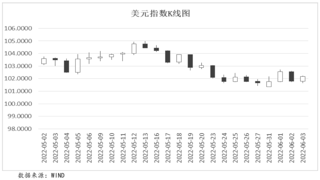 本周,美國經(jīng)濟(jì)數(shù)據(jù)的超預(yù)期走好和美聯(lián)儲(chǔ)加息預(yù)期的增強(qiáng)都對(duì)美元形成一定支撐。周三,美聯(lián)儲(chǔ)正式開啟“縮表”及美聯(lián)儲(chǔ)官員“鷹派”言論都支撐美元上漲;周四,5月“小非農(nóng)”數(shù)據(jù)(ADP就業(yè)數(shù)據(jù))錄得12.8萬人,不及市場(chǎng)預(yù)期的30萬人,對(duì)美元造成打壓;周五,非農(nóng)數(shù)據(jù)的超預(yù)期走好,支撐美元再度上行。截至本周五,美元指數(shù)收于102.1704,周內(nèi)累計(jì)收漲0.81%。