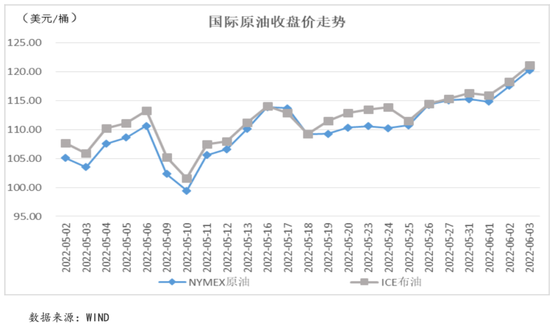 本周,在原油供給前景不確定性上揚(yáng)的背景下,國際油價(jià)一路飆升。具體來看,歐盟正式啟動(dòng)了對(duì)俄羅斯航運(yùn)石油的制裁,原油市場(chǎng)的供給局勢(shì)的不確定性大幅上揚(yáng);OPEC+雖松口同意在7月和8月增產(chǎn),但OPEC+中僅沙特和阿聯(lián)酋擁有閑置產(chǎn)能且閑置產(chǎn)能有限,因此市場(chǎng)對(duì)于石油供給前景依舊存疑。此外,美國經(jīng)濟(jì)數(shù)據(jù)的依舊強(qiáng)勁以及中國經(jīng)濟(jì)活動(dòng)逐步恢復(fù)都對(duì)于原油價(jià)格形成支撐。截至本周五收盤,NYMEX原油價(jià)格收于120.26美元/桶,周內(nèi)累計(jì)收漲2.30%;ICE布油價(jià)格收于121.08美元/桶,周內(nèi)累計(jì)收漲2.44%。