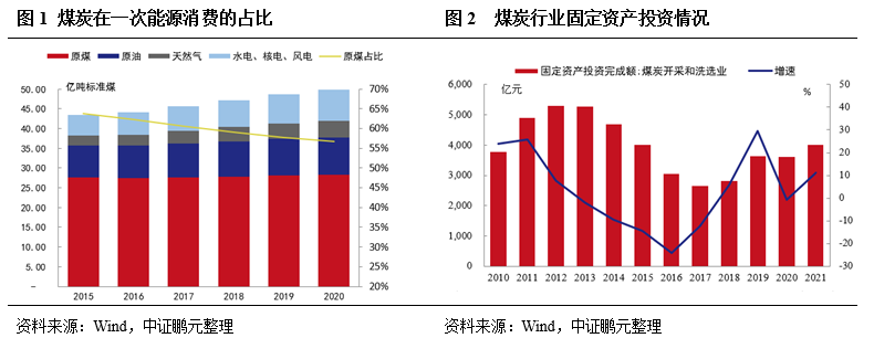 長期來看,雙碳目標(biāo)下煤炭消費(fèi)將步入下行周期。《碳達(dá)峰行動方案》中提出“十四五”時期嚴(yán)格合理控制煤炭消費(fèi)增長,“十五五”時期逐步減少,“嚴(yán)格控制新增煤電項(xiàng)目、有序淘汰煤電落后產(chǎn)能,推動煤電向基礎(chǔ)保障性和系統(tǒng)調(diào)節(jié)性電源并重轉(zhuǎn)型”,政策著力于從煤炭下游需求進(jìn)行逐步替代。在能源轉(zhuǎn)型的大背景下,隨著水電、風(fēng)電、光伏發(fā)電等清潔能源機(jī)組裝機(jī)量的提升,未來煤電機(jī)組將主要作為調(diào)節(jié)性電源的角色發(fā)揮調(diào)峰功能。中證鵬元預(yù)計(jì),在“碳達(dá)峰”前后煤炭消費(fèi)將步入下行周期,其在一次能源消費(fèi)中的份額將逐漸被新能源所替代。