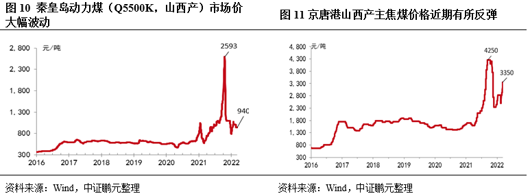 2021年煤炭價格大幅波動,全年價格中樞顯著抬升。2021年春節(jié)前受供給偏緊以及寒冬采暖需求旺盛影響,動力煤價格形成首輪上漲;隨著春節(jié)期間下游需求減弱,動力煤價格迅速回歸至全年低點(diǎn);隨后開工季需求快速恢復(fù),疊加晉陜蒙主產(chǎn)地安全環(huán)保檢查頻繁,動力煤價格開啟上漲。至2021年10月中旬,秦皇島動力煤市場價(Q5500K,山西產(chǎn))最高攀升至2,593元/噸,較年內(nèi)低點(diǎn)漲幅達(dá)到356.83%。2021年10月下旬以來,動力煤價格大幅回落,由最高點(diǎn)下跌至年末的800元/噸左右。煉焦煤方面,以京唐港山西產(chǎn)主焦煤為例,由于山西省環(huán)保檢查頻繁,煉焦煤供給緊張,下游需求較為旺盛,價格持續(xù)上漲至10月中旬的4,250元/噸,較年內(nèi)低點(diǎn)漲幅超過165%,隨后跌至年末的2,350元/噸。整體來看,全年價格中樞顯著抬升。我們認(rèn)為2021年煤價劇烈波動主要包括以下原因:(1)下游火電需求旺盛,2021年長期保持兩位數(shù)的增速;(2)安全生產(chǎn)和環(huán)保檢查力度加大,疊加自然災(zāi)害等影響,產(chǎn)地供應(yīng)持續(xù)受限;(3)行業(yè)形成一致上漲預(yù)期,市場報(bào)價短期內(nèi)一路走高;(4)國際大宗商品價格上漲。煤炭價格出現(xiàn)暴漲后,國家發(fā)改委等部門高頻開展保供穩(wěn)價工作,煤價迅速高位回落,一方面高頻的政策干預(yù)強(qiáng)勢打壓了價格上漲的一致預(yù)期;另一方面,政策推動保供增產(chǎn)收效,煤炭供應(yīng)出現(xiàn)明顯好轉(zhuǎn),社會庫存也有一定增長。