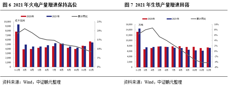 2021年我國經(jīng)濟(jì)繼續(xù)復(fù)蘇,工業(yè)企業(yè)生產(chǎn)整體用電負(fù)荷高,電廠日耗處于高位,同時下游非電耗煤需求仍有支撐,全年煤炭消費(fèi)同比增長4.6%。2021年火力發(fā)電量增速較快,鋼鐵等非電耗煤需求減弱。電力方面,2021年火電發(fā)電量5.77萬億千瓦時,同比增長8.4%,一方面2021年以來我國社會用電量保持較高增速,全社會總用電量為8.32萬億千瓦時,同比增長10.3%。另一方面,受氣候影響,水電發(fā)電量全年同比下降2.50%。鋼鐵方面,2021年我國生鐵產(chǎn)量為8.69億噸,同比下降4.3%,6月以來產(chǎn)量低于去年同期。建材方面,2021年全國水泥產(chǎn)量23.63億噸,同比下降1.2%,年內(nèi)增速由正轉(zhuǎn)負(fù)。