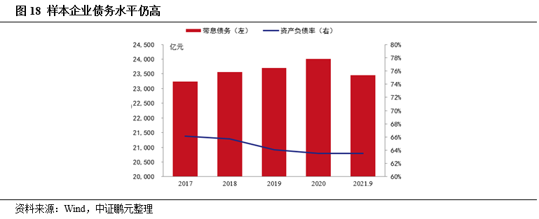 樣本企業(yè)資產(chǎn)負(fù)債率未有顯著改善,整體仍處于較高水平。截至2021年9月末,樣本企業(yè)平均資產(chǎn)負(fù)債率為62.71%,較年初下降0.57個百分點(diǎn)。各樣本企業(yè)之間資產(chǎn)負(fù)債率分化明顯,資產(chǎn)負(fù)債率最高值為87.68%,最低值為25.60%。高杠桿企業(yè)占比仍較高,資產(chǎn)負(fù)債率低于50%的企業(yè)共7家,占比19.44%;資產(chǎn)負(fù)債率在50%-70%的企業(yè)共16家,占比44.44%;資產(chǎn)負(fù)債率高于70%的企業(yè)共13家,占比36.11%。雖然受益于行業(yè)高景氣度,煤企整體盈利狀況較好,但資產(chǎn)負(fù)債率未有顯著改善,整體仍處于較高水平。中證鵬元預(yù)計(jì)中期煤炭價格運(yùn)行中樞有望較“十三五”期間抬升,需關(guān)注在雙碳目標(biāo)深化前的窗口期下,煤企財(cái)務(wù)杠桿水平能否出現(xiàn)壓降。