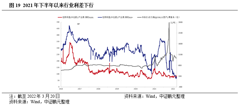 2021年下半年以來煤企信用利差在高景氣度下迅速下行至數(shù)年來低位,弱資質(zhì)煤企信用利差受政策影響波動較大
