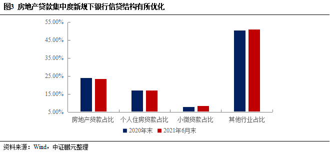 (1)房地產貸款集中度監管政策實施較為有效,商業銀行集中度超標情況有所好轉,信貸結構有所優化。自2020年末房地產集中度管理制度實施以來,截至2021年6月末,原39家上市銀行中有28家銀行房地產貸款集中度指標出現一定程度下降,平均房地產貸款占比下降0.46個百分點。另一方面,銀行新增信貸資金更多投向小微企業和非房地產領域,信貸結構有所優化。