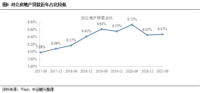 (3)總量角度,對公房地產貸款占比較為有限,房地產貸款集中度監管政策對銀行業未來總體資產質量的影響可控。對公地產貸款總量占比較為有限,截至2021年6月末,39家上市銀行對公房地產貸款占比僅為6.47%,個人住房按揭貸款占比為17.03%,且由于個人住房貸款的資產質量仍然比較優異,我們認為房地產貸款集中度監管要求帶來的房地產市場融資環境變化對商業銀行的資產質量影響整體較為有限。