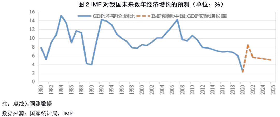 后疫情時(shí)期,我國經(jīng)濟(jì)以穩(wěn)定恢復(fù)為主線,并逐步向疫情前的下行趨勢(shì)回歸。2021年在上年受到疫情嚴(yán)重沖擊、基數(shù)較低的基礎(chǔ)上取得較高的增長(聯(lián)合資信預(yù)計(jì)全年同比增長8.5%左右)。但此后基數(shù)效應(yīng)消失,疫情影響持續(xù),我國投資、消費(fèi)和凈出口增長將回歸潛在增長,步入2010年以來的下行通道,達(dá)到5%~6%的水平,與央行2021年第一號(hào)工作論文測(cè)算的“十四五”期間我國潛在產(chǎn)出增速基本一致(5.0%~5.7%),總體繼續(xù)保持中高速增長。IMF預(yù)測(cè),2021年中國GDP在低基數(shù)效應(yīng)下可能達(dá)到8.4%,但在基數(shù)效應(yīng)消失后的2022年,增速即將大幅回落至5.57%,此后持續(xù)下行,到2026年下行至5%以下。世界銀行和經(jīng)合組織的對(duì)我國2021年(8.5%[4]和8.04%)、2022年經(jīng)濟(jì)增長(5.2%和4.95%)的預(yù)測(cè)均低于IMF預(yù)測(cè)。盡管國際機(jī)構(gòu)對(duì)我國未來經(jīng)濟(jì)增長速度的預(yù)測(cè)偏于悲觀,但其反映的總體趨勢(shì)具有一定的參考性。經(jīng)濟(jì)增速下行趨勢(shì)中,強(qiáng)順周期行業(yè)企業(yè)的信用質(zhì)量可能會(huì)有所下降。