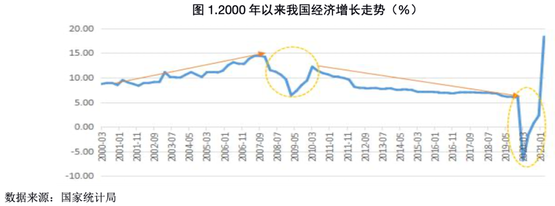 國際金融危機(jī)后,我國經(jīng)濟(jì)增速在“四萬億”計(jì)劃的強(qiáng)刺激下迅速回升,于2010年一季度GDP增速恢復(fù)至12.2%的峰值以后,開啟了長期持續(xù)的下行趨勢(shì),2019末下行至6%,下滑了6.2個(gè)百分點(diǎn)。2020年一季度,我國受新冠疫情沖擊,經(jīng)濟(jì)活動(dòng)急劇收縮,GDP同比下降6.8%,創(chuàng)上世紀(jì)70年改革開放以來新低。隨后國內(nèi)疫情迅速得到控制,經(jīng)濟(jì)逐漸穩(wěn)步復(fù)蘇,2020年全年GDP增速為2.3%,成為全球唯一正增長的主要經(jīng)濟(jì)體,但仍處于較低增長水平。