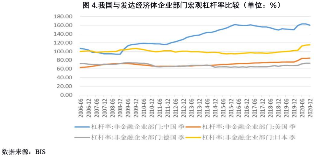 我國企業(yè)部門杠桿率一直處于較高水平,疫情發(fā)生后監(jiān)管層為了穩(wěn)企保崗,支持企業(yè)渡過難關(guān),迅速注入流動(dòng)性,放松信用條件,企業(yè)部門宏觀杠桿率迅速攀升,2020年6月末達(dá)到165.2%的歷史最高值。此后,杠桿率雖然有所下降,但仍然維持在歷史較高水平(2021年一季度末為161.40%)。BIS數(shù)據(jù)顯示,2020年末我國非金融企業(yè)部門宏觀杠桿率為160.70%, 同期美國、日本、德國非金融企業(yè)部門的宏觀杠桿率分別為84.60%、115.6%和73.2%,均遠(yuǎn)低于我國。后疫情時(shí)期,我國經(jīng)濟(jì)恢復(fù)對(duì)債務(wù)驅(qū)動(dòng)的依賴依然較強(qiáng),經(jīng)濟(jì)增長的基礎(chǔ)不夠牢固,因而具有一定的脆弱性,易受國內(nèi)國際風(fēng)險(xiǎn)事件的沖擊,或?qū)⒊掷m(xù)面臨防范化解風(fēng)險(xiǎn)的較大壓力。