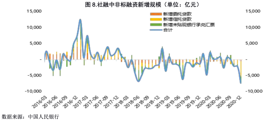 另外,需關(guān)注2021年非標(biāo)融資縮量對(duì)企業(yè)流動(dòng)性的壓力。2018年以來新增非標(biāo)融資出現(xiàn)了負(fù)增長的趨勢(shì),企業(yè)的融資渠道逐步縮窄。自2020年四季度以來,非標(biāo)融資縮量程度再次加深,資管新規(guī)過渡期延長至2021年底,2021年也將大概率延續(xù)縮量趨勢(shì),將對(duì)信用債的償付能力產(chǎn)生負(fù)面影響,尤其是通過非標(biāo)融資較多的城投和房地產(chǎn)企業(yè)。