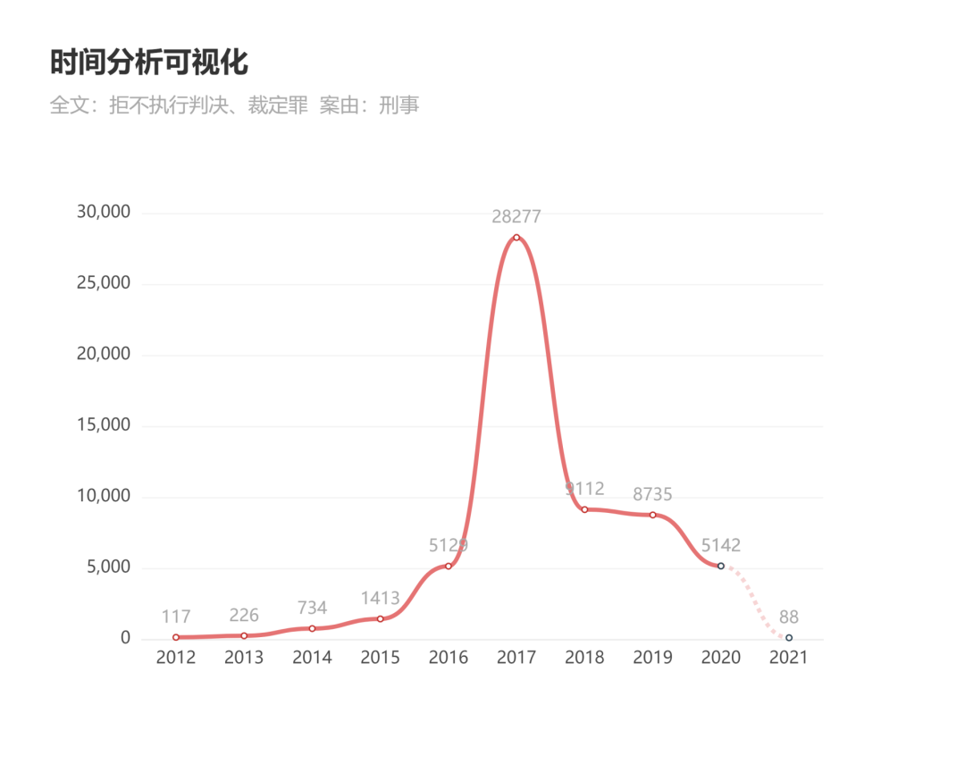 根據(jù)第三方數(shù)據(jù)平臺的裁判文書數(shù)據(jù)顯示,拒執(zhí)罪在2016年前基本沒有太多應用。2016年到2020年期間,呈上升態(tài)勢,但也均未超過1萬(注:2017年數(shù)據(jù)28277件中,河南省貢獻25381件,屬于當年的個別偏差現(xiàn)象)。