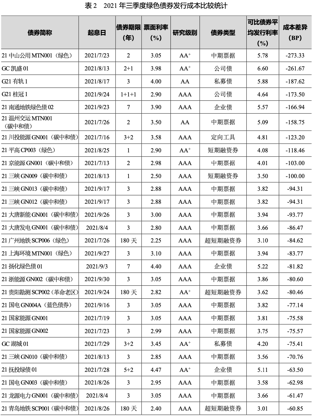 2021年三季度,我國新發綠色債券中有94只擁有可比債券,其中68只呈現成本優勢,占比72.34%。
