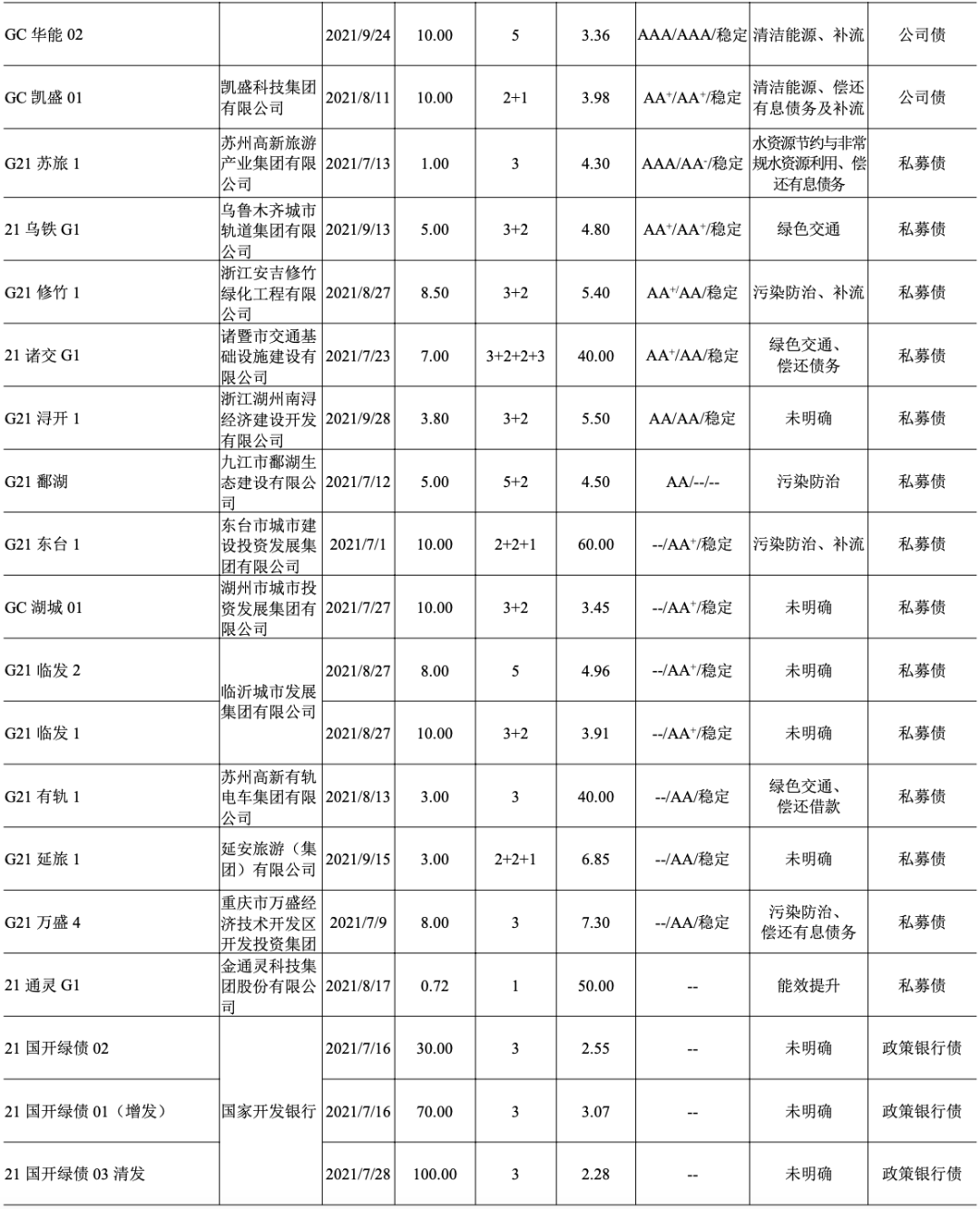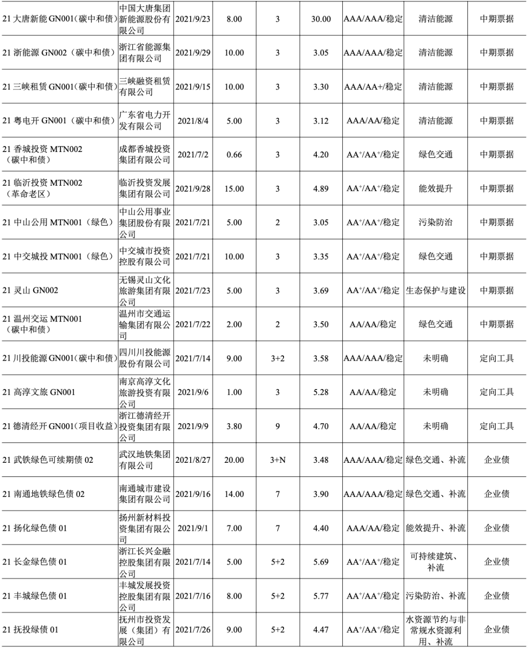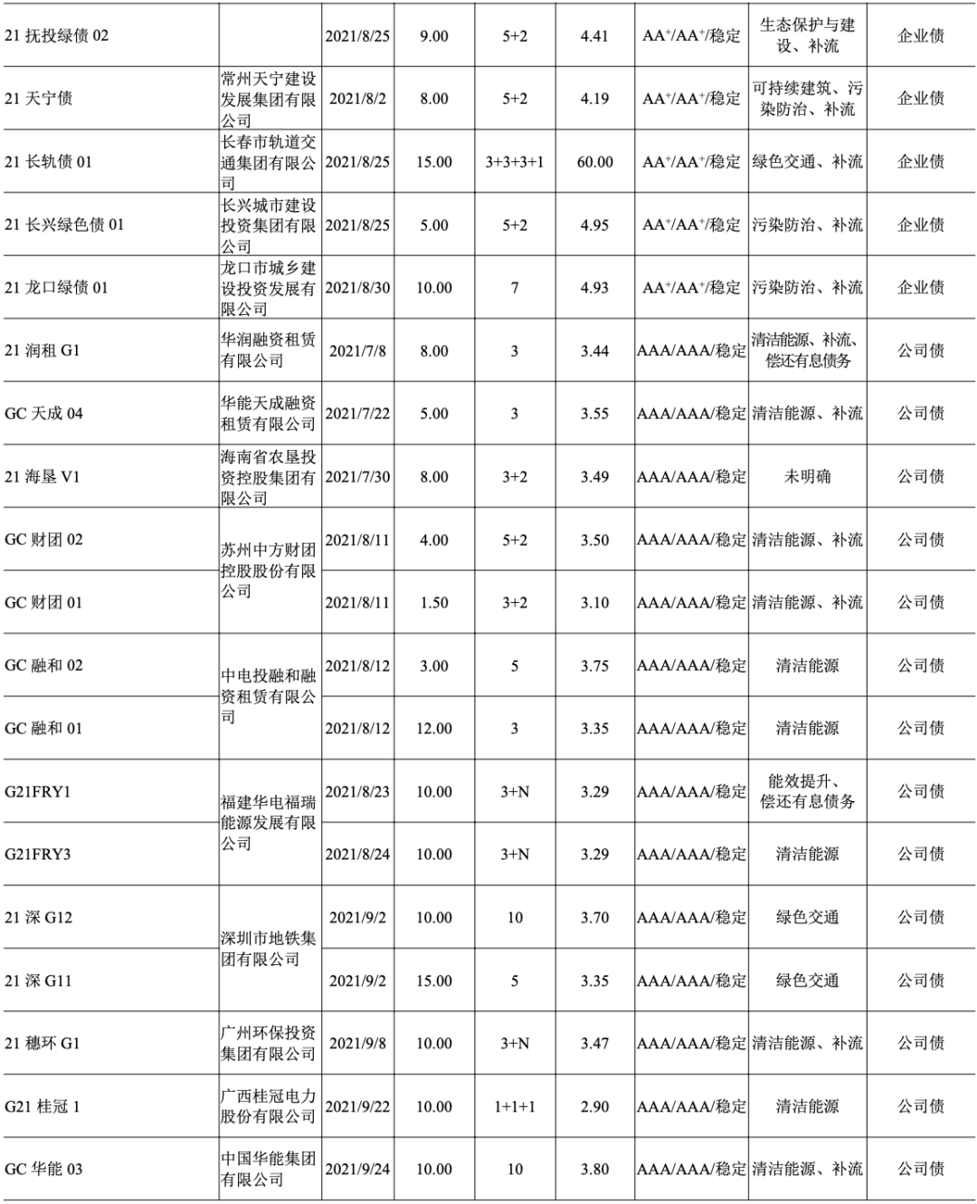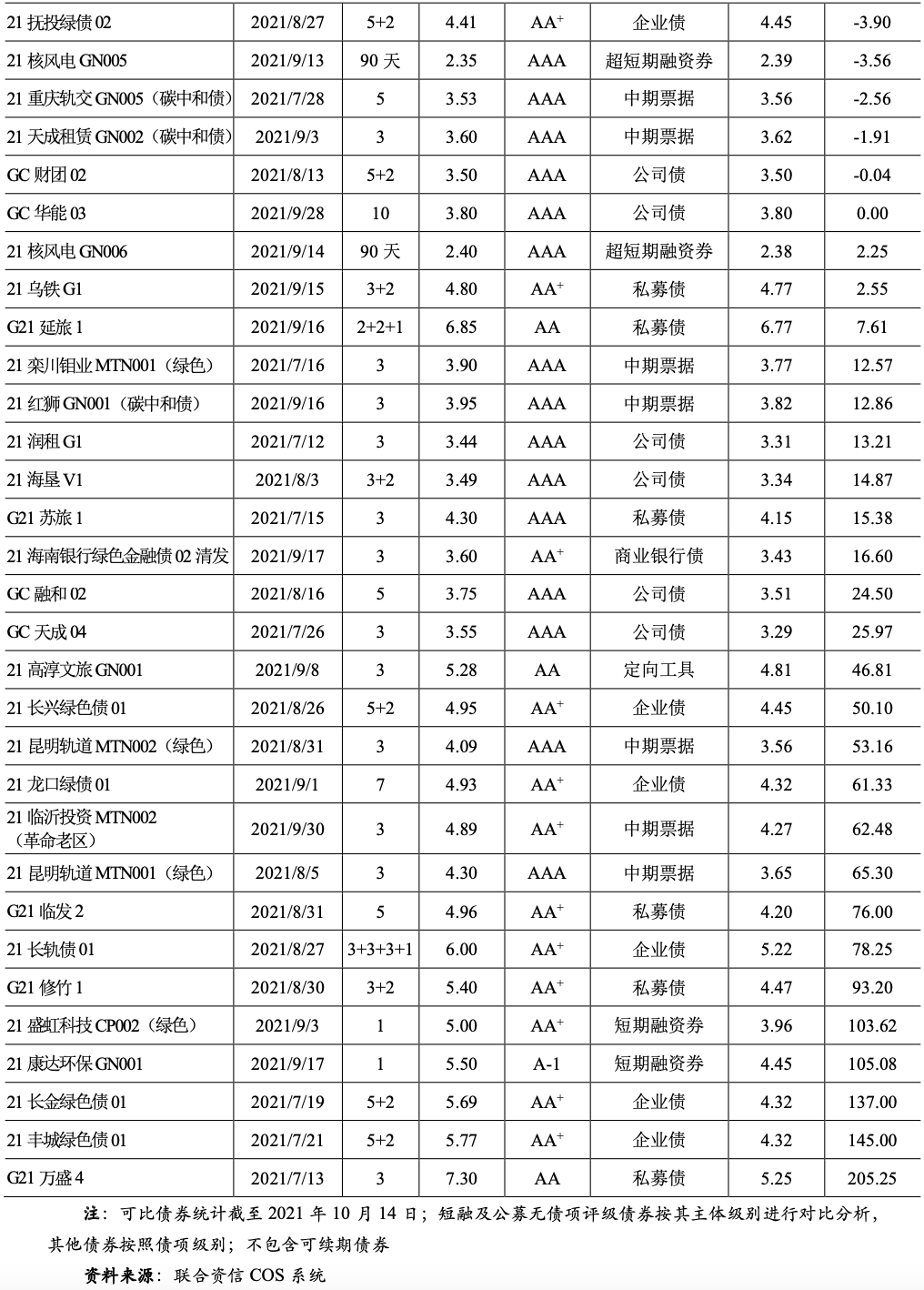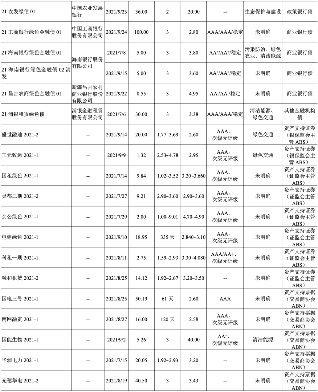 2021年三季度,聯合資信受托為綠色其他金融機構債“21浦銀租賃綠色債”、綠色商業銀行債“21昌吉農商綠色金融債01”“21工商銀行綠色金融債01”、綠色公司債“21潤租G1”“GC凱盛01”“GC華能03”“GC華能02”、綠色私募債“G21潯開1”、綠色中期票據“21香城投資MTN002(碳中和債)”“21京能源GN001(碳中和債)”“21錫交通MTN005(碳中和債)”“21京能潔能GN001(碳中和債)”“21國家能源GN001”“21國家能源GN002”“21光大綠環MTN001(碳中和債)”“深能源MTN001(碳中和債)”“21粵電開GN001(碳中和債)”“21興城投資GN001”“21魯能源GN005(碳中和債)”、綠色超短期融資券“21山東核電SCP009(碳中和債)”“21核風電GN004”“21核風電GN005”“21核風電GN006”、綠色短期融資券“21平高CP003(綠色)”“21盛虹科技CP002(綠色)”、綠色定向工具“21德清經開GN001(項目收益)”和綠色資產支持票據“國能生物2021-1”提供信用評級。聯合資信所評綠色債券發行期數(27期)、發行家數(23家)和發行規模(430.57億元)在2021年三季度有評級的綠色債券總發行期數、發行家數和發行規模中的占比分別為24.32%、28.05%和32.79%,聯合資信所評綠色債券發行期數、家數和規模均位列市場第二。其中,“GC凱盛01”“21平高CP003(綠色)”“21京能源GN001(碳中和債)”“21國家能源GN001”“21國家能源GN002”“21粵電開GN001(碳中和債)”“21錫交通MTN005(碳中和債)”“21興城投資GN001”“21工商銀行綠色金融債01”“G21潯開1”“21核風電GN004”“GC華能02”“深能源MTN001(碳中和債)”“21光大綠環MTN001(碳中和債)”“21魯能源GN005(碳中和債)”“21核風電GN005”16只債券具有成本優勢[1],成本優勢分別為261.67BP、118.46BP、103.00BP、75.58BP、75.57BP、49.02BP、46.58BP、41.64BP、39.00BP、36.07BP、34.30BP、34.22BP、30.55BP、22.14BP、13.92BP和3.56BP。