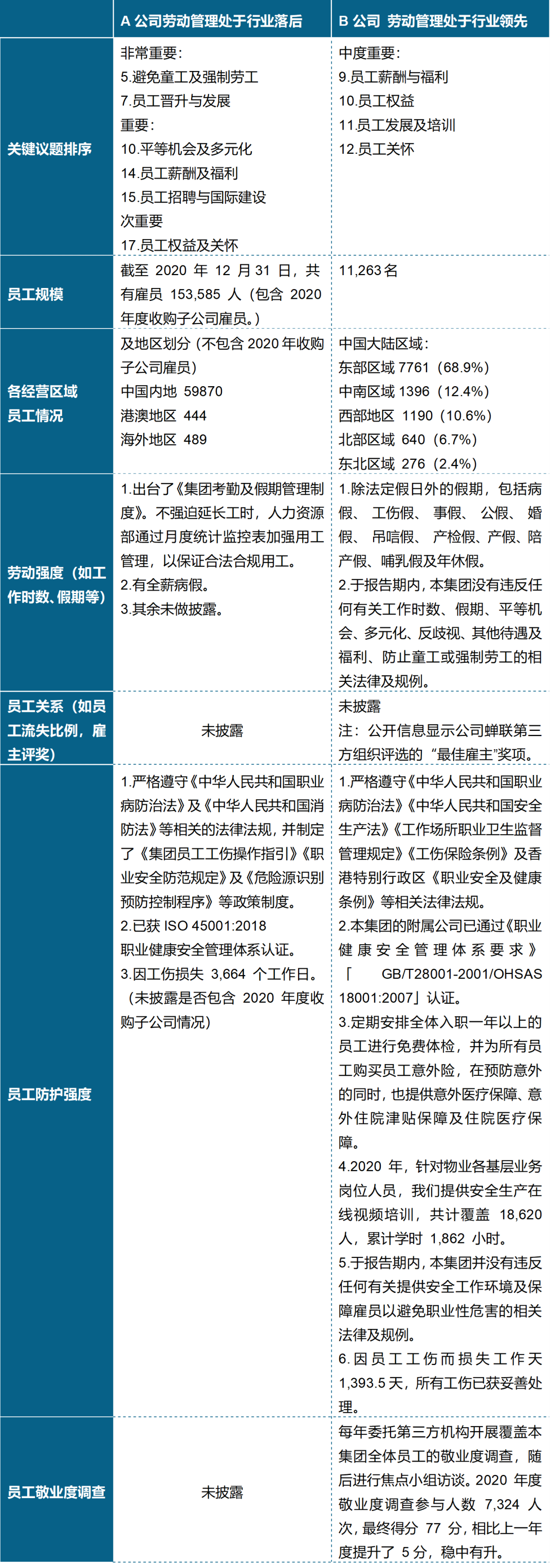 港股上市物企中,大部分關(guān)鍵議題的披露處于行業(yè)平均水平,但在勞動管理關(guān)鍵議題上,有物企處于行業(yè)落后水平,也有物企處于行業(yè)領(lǐng)先水平。根據(jù)MSCI官網(wǎng)顯示,勞動管理指公司根據(jù)其勞動力的復(fù)雜性(規(guī)模、勞動強度和經(jīng)營區(qū)域)、員工關(guān)系、工人防護強度以及員工敬業(yè)度進行評估,MSCI并沒有對勞動管理這一關(guān)鍵議題的具體評判標準予以公示。但除員工敬業(yè)度調(diào)查之外,其余內(nèi)容基本為聯(lián)交所規(guī)則要求ESG報告披露內(nèi)容。故根據(jù)MSCI對勞動管理解釋的幾個方面的理解,以兩家上市物企2020年ESG報告的信息披露對比如下: