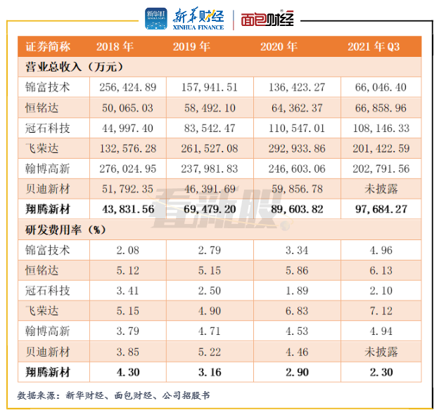 截至招股說明書簽署日,翔騰新材已取得的74項專利均為實用新型專利,而無發明專利,且技術人員數量僅為73人,發明專利數量和技術人員數量均明顯低于同行可比公司飛榮達、錦富技術等。作為薄膜器件供應商,公司的研發投入和能力或難具競爭力,面臨的產品更新迭代風險或較高。
