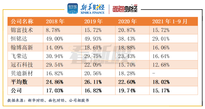 值得關注的是,2018年至2021年前三季度,翔騰新材的綜合毛利率已低于同行業可比公司的平均毛利率。如未來的行業競爭加劇,2021年前三季度以來的主營產品降價趨勢延續,公司的盈利能力或將進一步承壓。