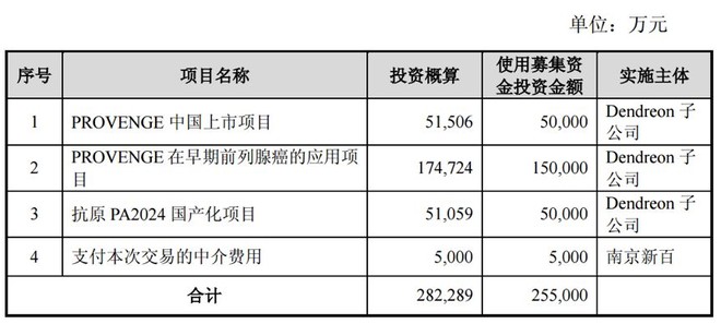 根據(jù)南京新百的收購方案,公司擬配套募資25.5億元用于Provenge在中國上市項(xiàng)目、Provenge在早期前列腺癌的應(yīng)用項(xiàng)目、抗原PA2024國產(chǎn)化項(xiàng)目的建設(shè)運(yùn)營等。