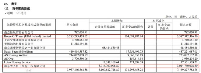 一個(gè)是2014年收購英國百貨公司HOF產(chǎn)生的商譽(yù),加上后來匯率波動(dòng)的影響截止2017年底,這部分的商譽(yù)余額是33.87億元。一個(gè)是2017年并表齊魯干細(xì)胞新增商譽(yù)約30.15億元。以下為公司2017年年報(bào)中披露的商譽(yù)明細(xì)情況: