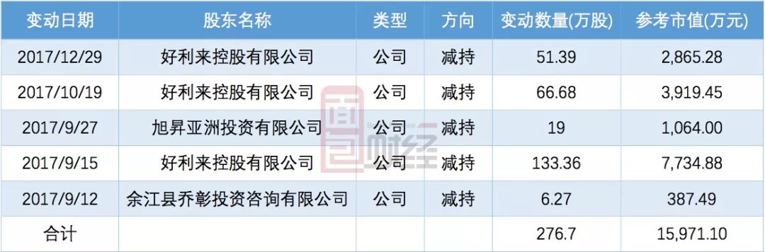 2017年9月12日-2017年12月29日,實(shí)控人控制的好利來(lái)控股、旭昇亞洲投資以及高管們的持股平臺(tái)余江縣喬彰、余江縣衡明一共減持6次,累計(jì)減持276.7萬(wàn)股,參考市值近15,971.10萬(wàn)元。以下為公開(kāi)披露的持股變動(dòng)記錄: