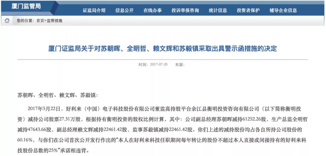 而在此之前,2017年7月,好利來(lái)的高管蘇朝暉、全明哲、賴文輝和監(jiān)事蘇毅鎮(zhèn)因通過(guò)持股平臺(tái)余江縣衡明違規(guī)減持收到廈門證監(jiān)局出具的警示函: