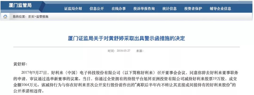 在警示函中證監(jiān)會(huì)要求公司“吸取教訓(xùn),引以為戒,嚴(yán)格按照有關(guān)規(guī)定減持股份,杜絕此類事件再次發(fā)生”。然而僅僅時(shí)隔兩個(gè)月,好利來(lái)的實(shí)控人黃舒婷再次違規(guī)減持,又遭到的監(jiān)管部門的處罰: