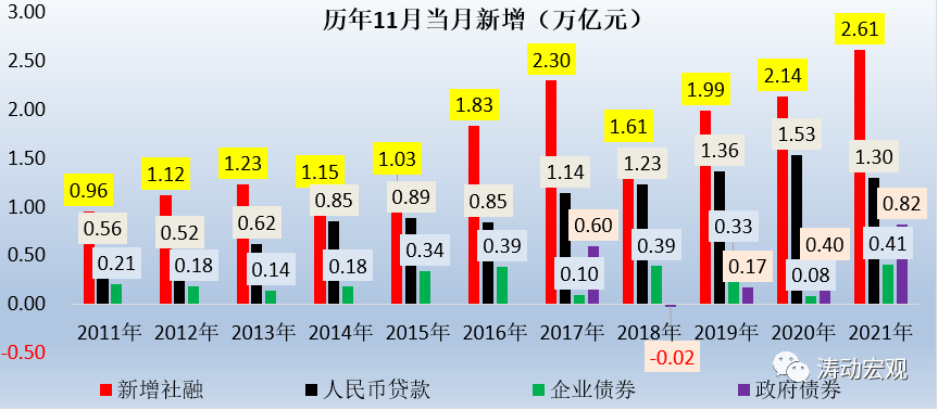 債券同比明顯多增的因素主要有兩個,政府債券是因為地方政府在10-11月放量發(fā)行,企業(yè)債券則是由于去年11月受河南永煤事件影響導致同期基數較低。