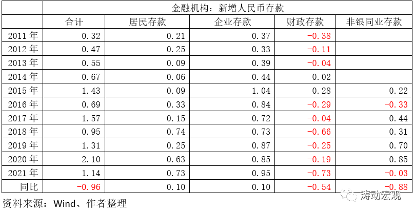 今年11月當月,居民存款與企業(yè)存款分別新增0.73萬億和0.95萬億,同比分別多增0.10萬億和0.10萬億,創(chuàng)歷年11月新增最高。與此同時,財政存款與非銀同業(yè)存款10月當月分別少增0.54萬億元和0.88萬億元,反映出政府債券發(fā)行、投資支出增加以及非銀體系流動性下降等因素。